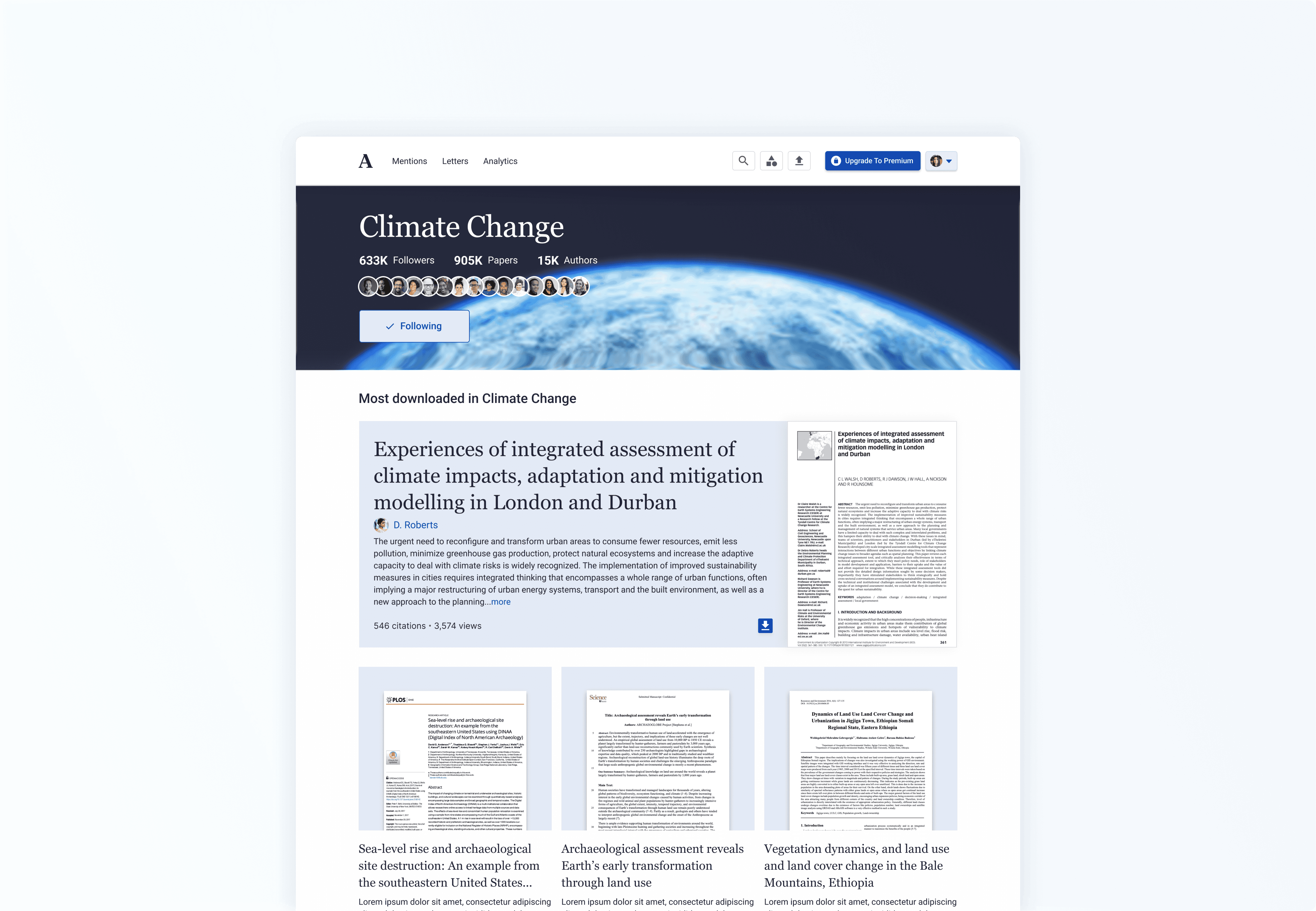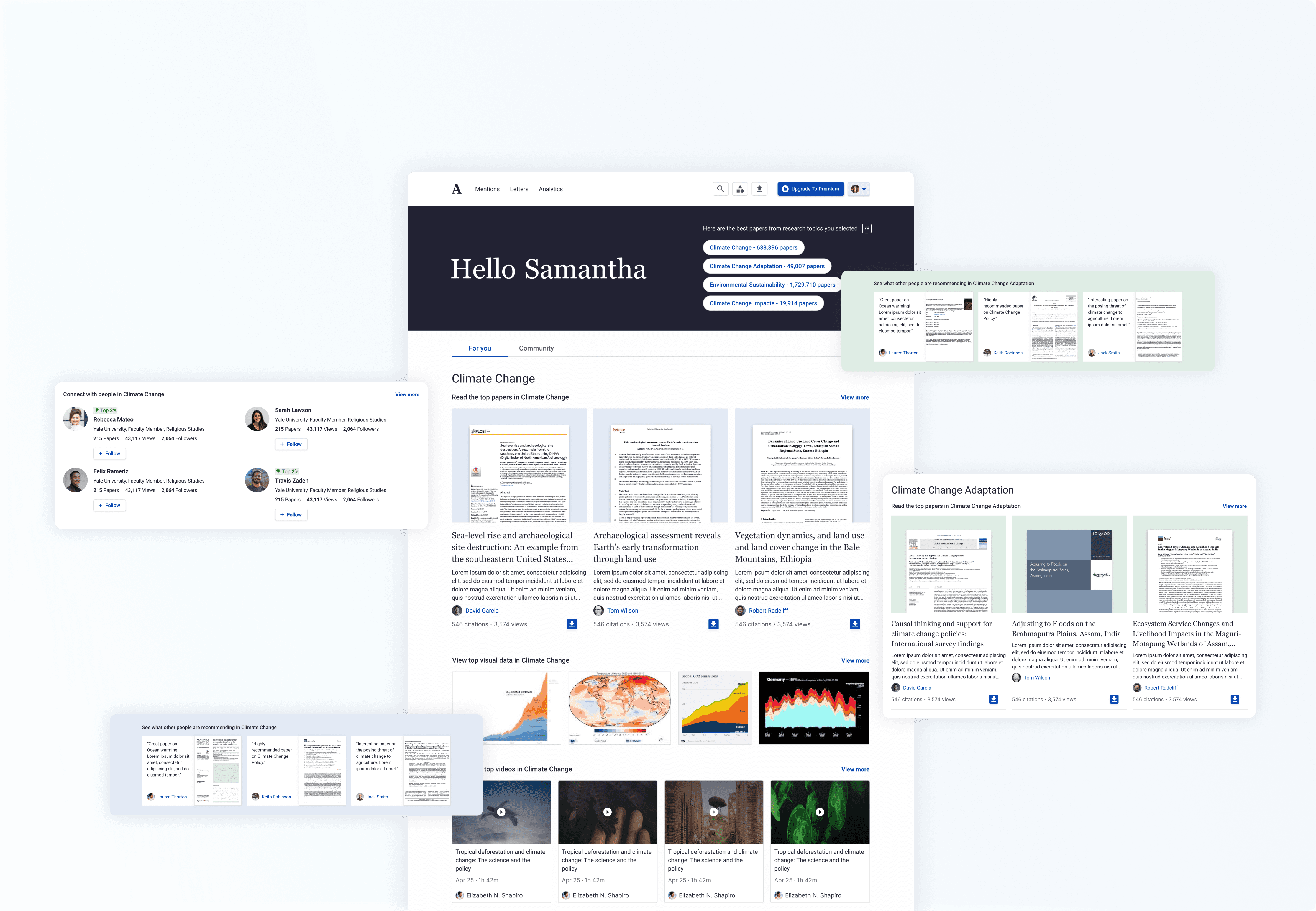 Each topic has a dedicated landing page that extends the feed's content hierarchy. When a researcher navigates from their feed to a topic page, the same organizing logic - papers first, then supporting content, connections, and recommendations - makes the experience immediately familiar.