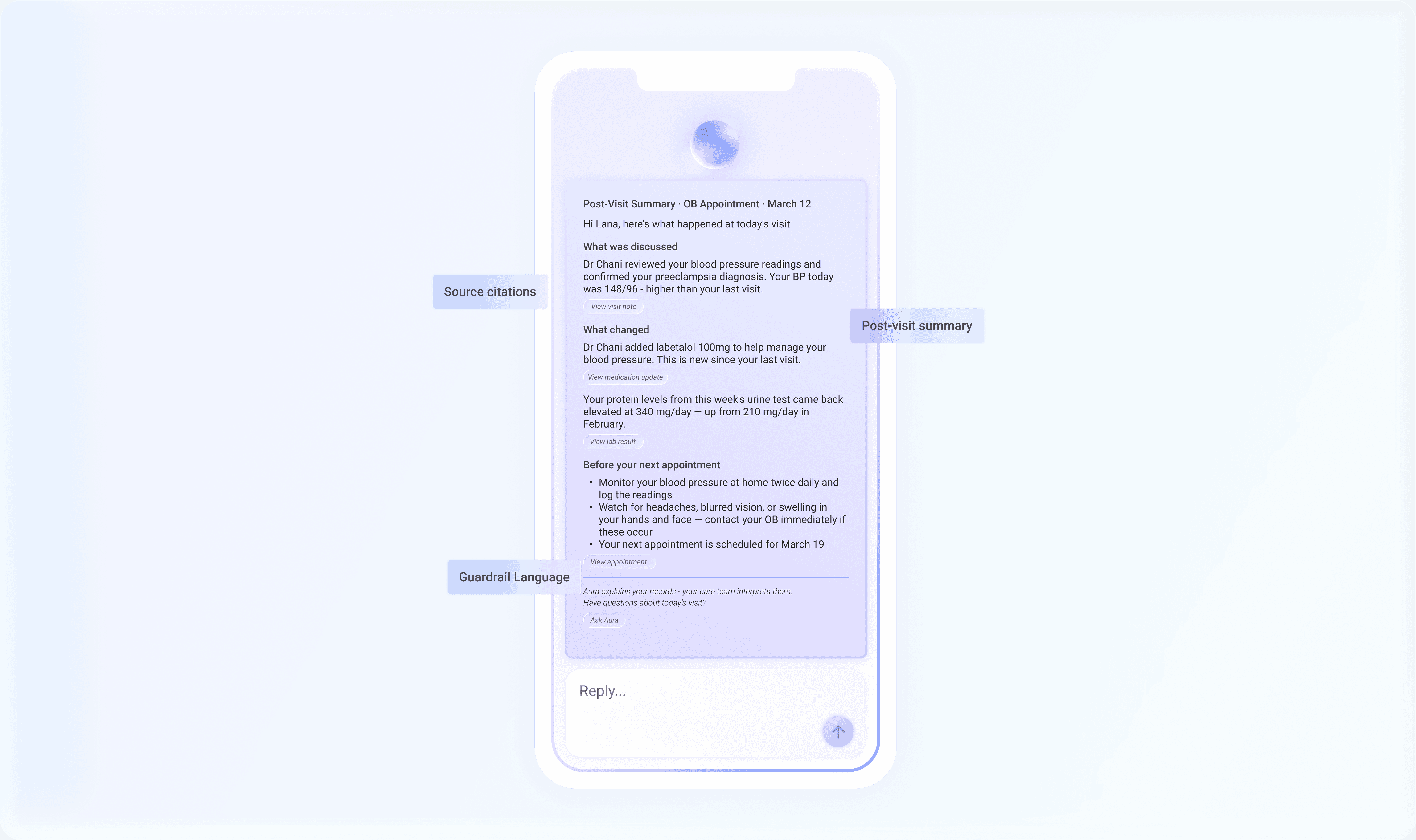 Aura explains and contextualizes - it never interprets symptoms into diagnoses or suggests medication changes. The guardrail is hard and always visible. "This is what your chart says. Your doctor is the right person to interpret it."