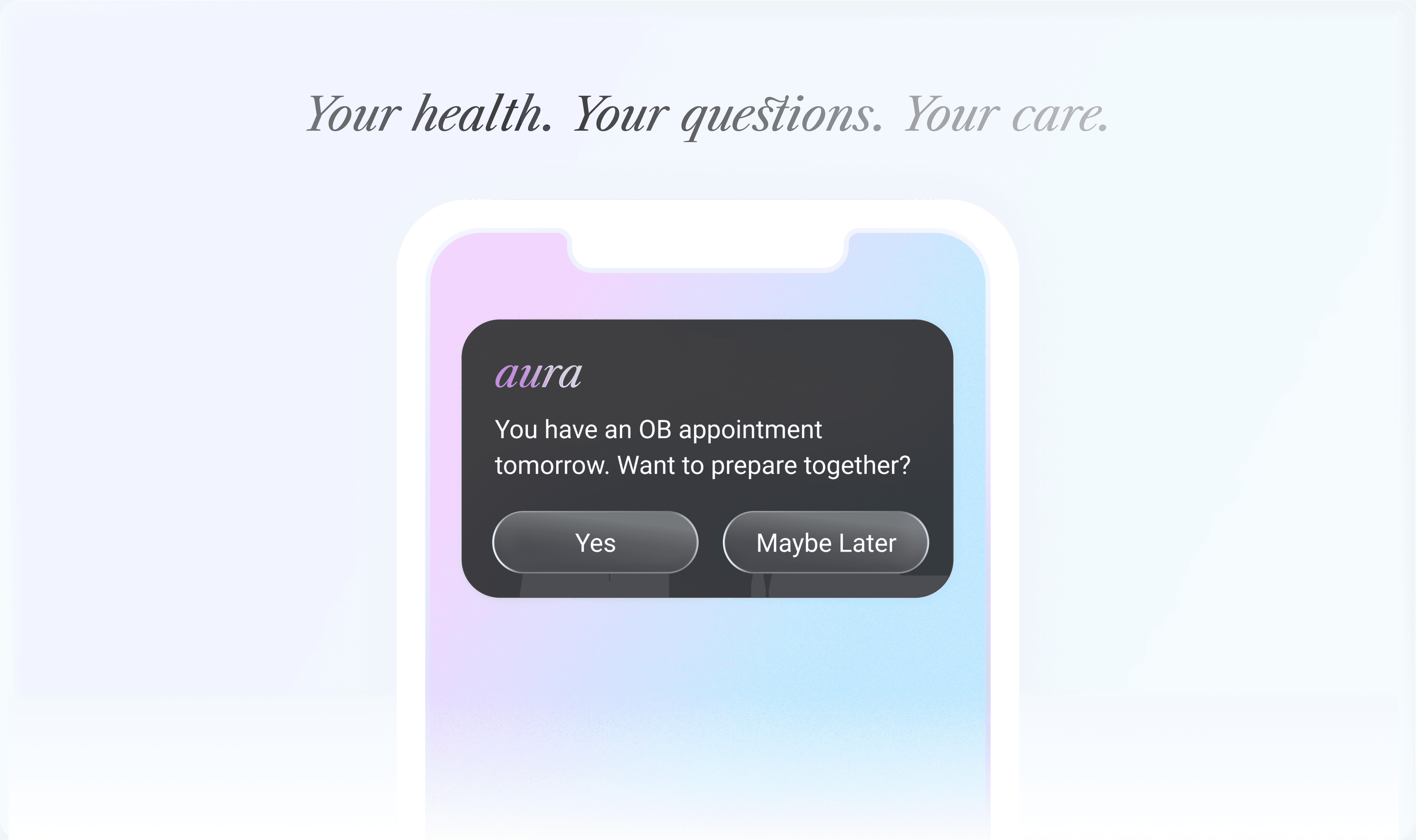 The AI is not a replacement for a provider. Every interaction has a visible path to message your care team, find urgent care, or call the office. Aura augments the relationship with your doctor - it doesn't substitute for it.