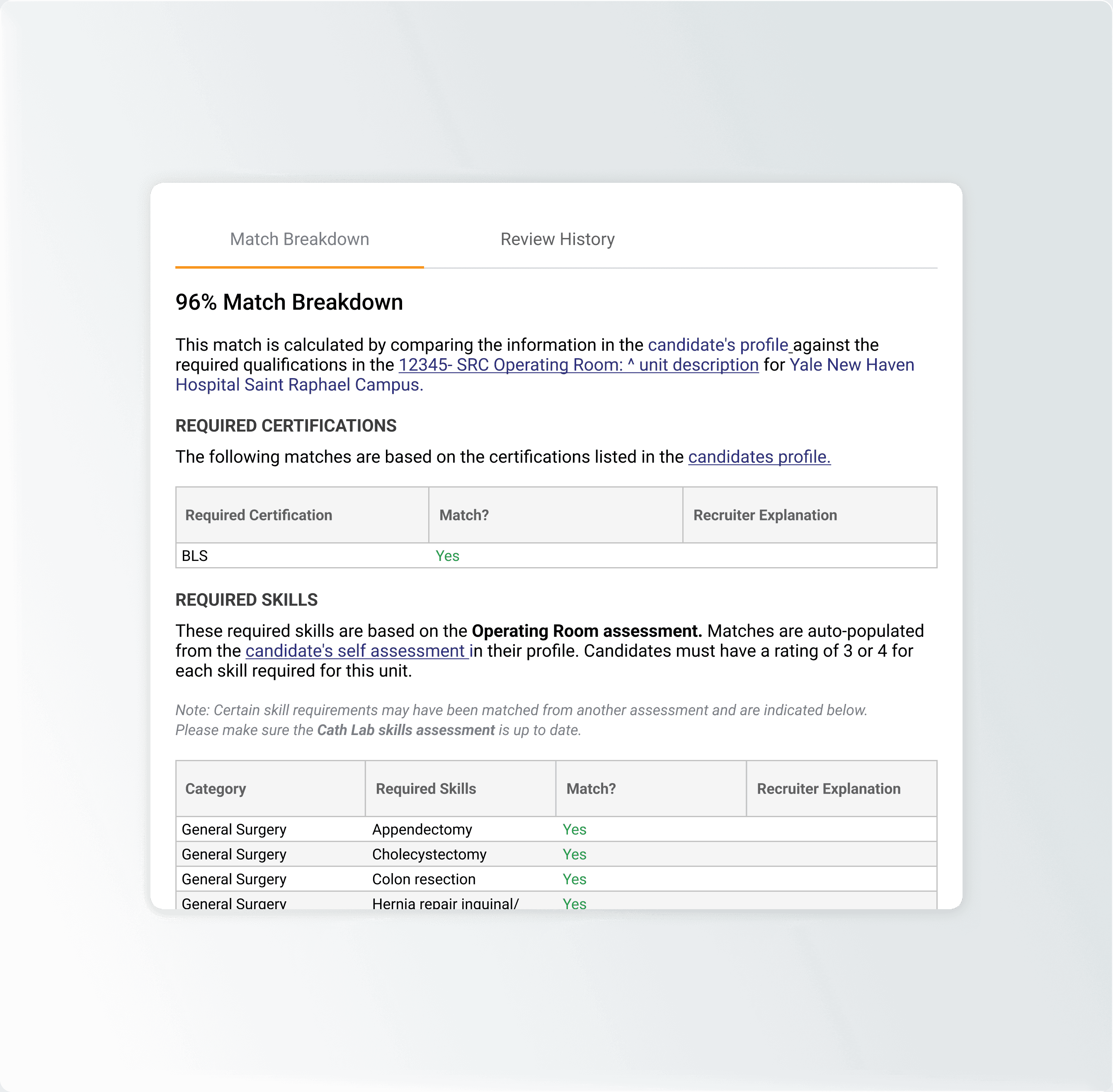 At the core of every clinical evaluation is the Match Breakdown - a component that already lived across four Nova modules (Clinical, Job Submittal, Account Manager Live List and Job Details page). It compares a candidate's certifications, skills, work experience, and other requirements against what a job actually demands, surfacing where a candidate meets the bar, where they fall short, and where manual review is still needed.